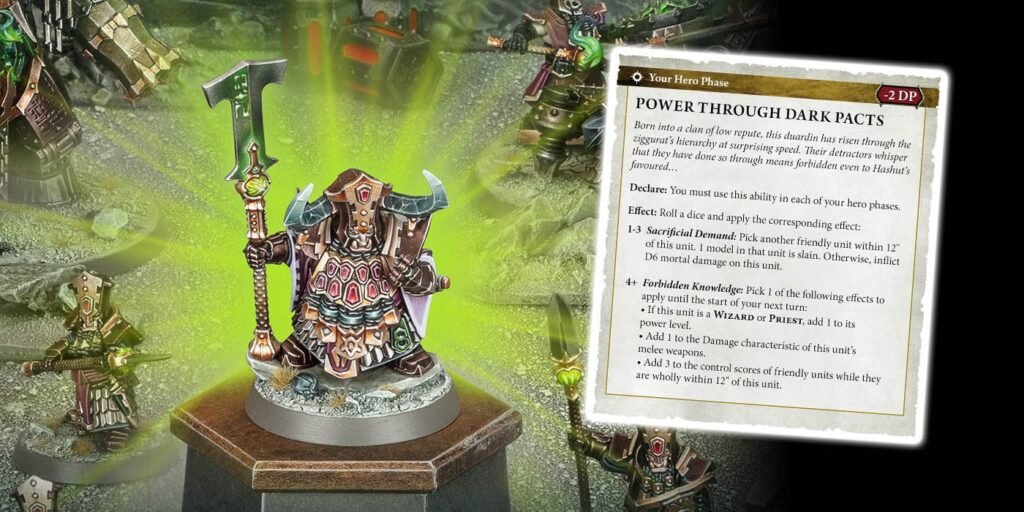 As you can see, this one is kind of spicy. Not only does in cost 2 DP to include but you MUST use it in each of your hero phases. It’s brutal if you don’t roll that 4+. This ability one shot your character on a bad roll or just straight up slay 1 model in a friendly unit. Ouch. However, if you do manage to roll that 4+, you get one of those rather nice bonuses. Are you feeling lucky?