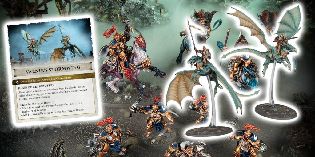 “The aerial Stormdrake Guard are the stuff of legend, and the Knight-Draconis Adlus Valnir and his bodyguard Ortana are infamous for their exploits. They often lend their particular brand of fiery vengeance to a wide range of allies. Plunging from on high in a manoeuvre known as the Hour of Retribution, Valnir’s Stormwing can add 1 to their Wound rolls and Save rolls once per battle.”