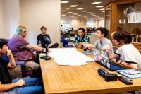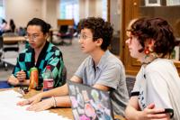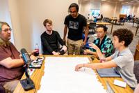 From left, Ari Costulis, Cody Leveck and Van Bui discuss the tabletop role-playing game they are creating, Luxumbra.