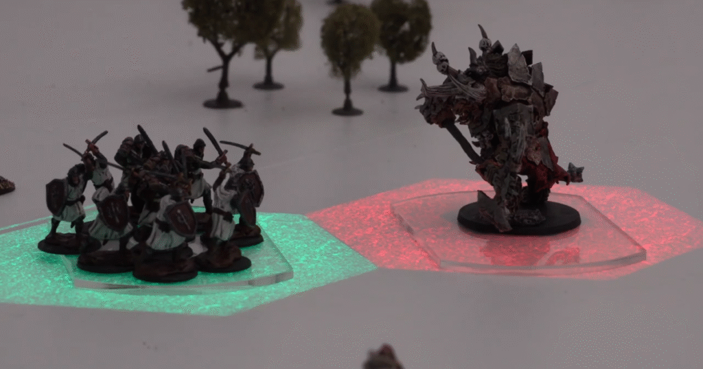 The Intelligent Wargames Table is a hexagonal 33-square-foot surface equipped with a computer, speakers and a digital layer beneath the surface used to convey information during battles. It can track individual units or entire squads as they move, and players can store battle stats so that when adversaries meet, the table will automatically crunch the relevant maths. It uses coloured hexes and flashing patterns to communicate info back to players; a video showcase on Valkyrx’s website highlights winners, losers, status effects, stealthed units and spell ranges on the table during play.