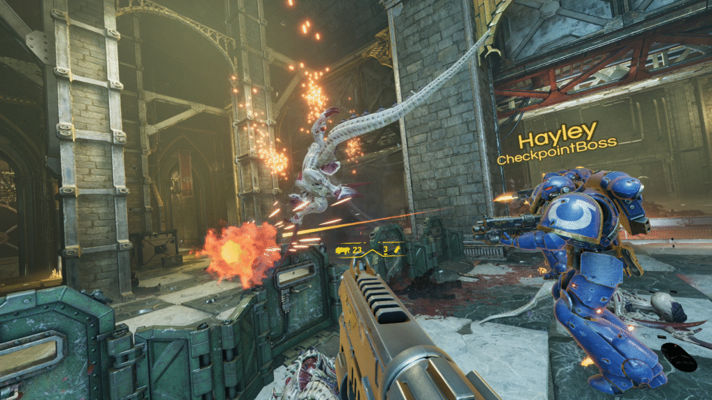 The Warhammer 40,000 universe feels well-represented here, especially in the feel of the guns. Similar effects to those seen in Warhammer 40,000: Space Marine II have been ported in, and the heavy weapons especially sing as they tear through the hordes of enemies coming your way. The melta rifle was a personal favourite as it showers the screen and your enemies in a flash of purple and orange light. It’s impressive the headsets could keep up with so many effects and enemies on-screen at once. I’m no expert on the platform, but the HTC headset I wore never struggled with the game, even in more intense sequences like the Hive Tyrant fight at the end.