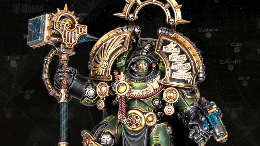 The new Saturnine Praetor is a force commander wearing the colossal new Saturnine terminator armor. The model can be equipped with either a Saturnine Disruption Hammer or a Saturnine War Axe, and a wrist-mounted plasma weapon of some sort. This armor is as powerful as Space Marines get.